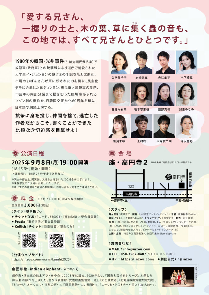 1980年の韓国・光州事件(5·18光州民衆抗争)で戒厳軍(政府軍)との銃撃戦により道庁で射殺された大学生イ・ジョンヨンの妹クミの手記をもとに劇化。市場のおばあさんが軍に殺されたのを機に民主化デモに合流した兄ジョンヨン。市民軍と戒厳軍の攻防、市民軍の内部分裂まで描き切った臨場感あふれるマダン劇の傑作を、日韓国交正常化60周年を機に、日本語で朗読上演する。